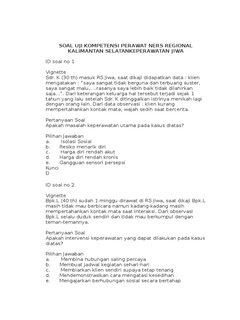 Contoh soal uji kompetensi keperawatan jiwa beserta kunci jawaban revisi 2021 : Contoh soal uji kompetensi keperawatan beserta kunci jawaban pdf. > keperawatan medikal bedah > keperawatan maternitas > keperawatan anak > keperawatan jiwa > keperawatan keluarga > keperawatan gerontik . Soal ukom keperawatan keluarga, soal ukom keperawatan jiwa, soal. Uji kompetensi (ukom) perawat kumpulan soal uji kompetensi perawat.